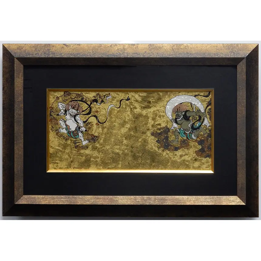 通常の絵画は紫外線による変色が避けられませんが、天然石を用いることで「50年、100年と色あせない輝き」を実現しました。俵屋宗達の晩年の最高傑作とされる『風神雷神図』。その躍動感あふれる美しさを、永遠の輝きを放つ天然宝石で再現した至高の逸品です。