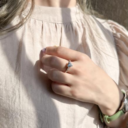 1.17ctのアクアマリンがひときわ輝く K18イエローゴールドのリング 三角形のシャープなカットが印象的なアクアマリンは 澄んだ青が指先に凛とした存在感を与えます アームには瑞々しいダイヤモンドを連ね ラグジュアリーな輝きをプラス クラシカルな中にもモダンな洗練を感じさせるデザインは 日常の装いにも特別な日にもぴったりです