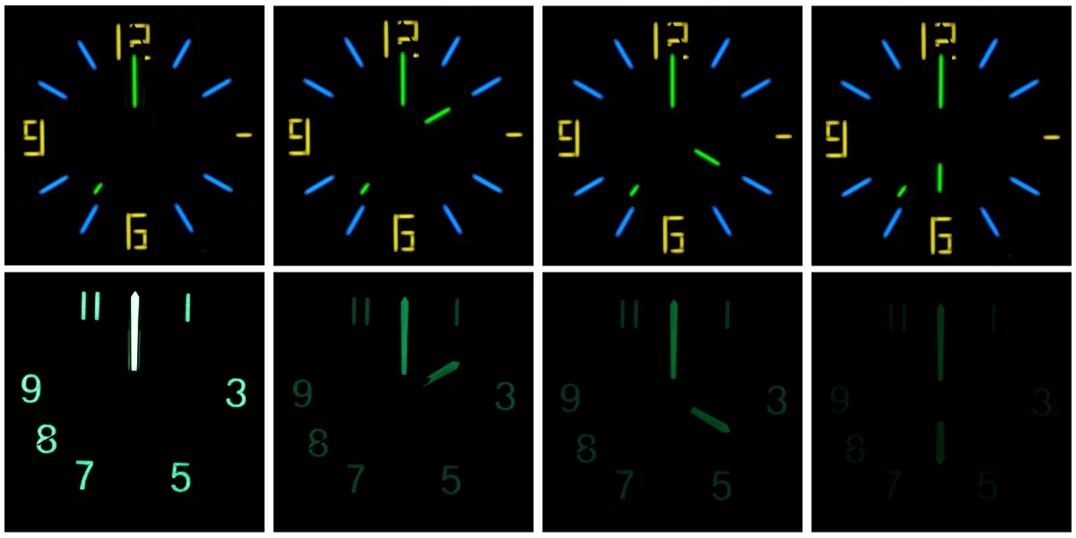 マイクロ・ガスライトは夜間や暗闇の中で時刻を判読する時に最も適している夜光システムです。昼夜を問わず、四六時中自発光しているのでボタンの操作や手首を動かす等の特別な動作をせずとも時計の文字盤面が確認出来ます。