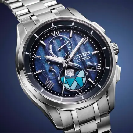 縦のブルーグラデーションで教会に降り注ぐさまざまな光を描いた文字板に、半透明の印刷を施した白蝶貝を使用し、**美しく光るステンドグラス**を表現。まるでステンドグラス越しの夜空を見上げるように、**ムーンフェイズ(月齢)**の満ち欠けを確認できます。