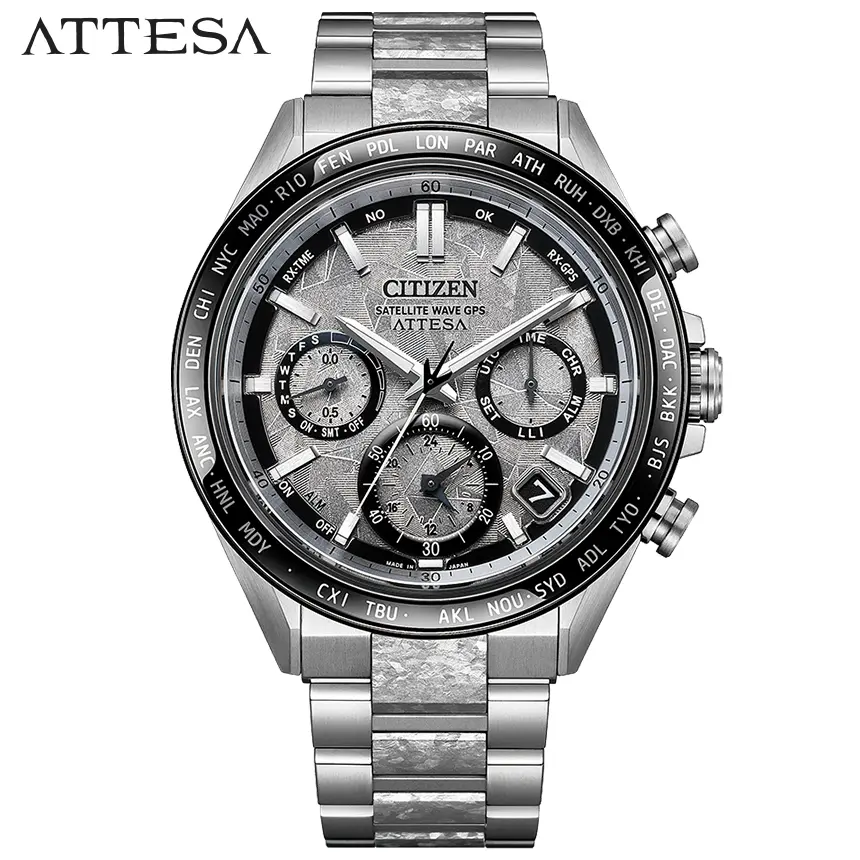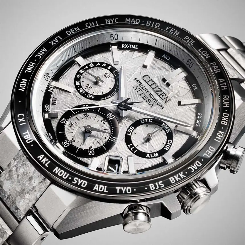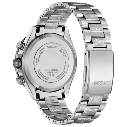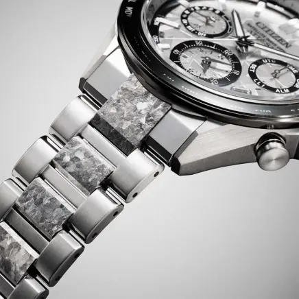 シチズン独自の技術で開発した結晶チタニウムを中駒に採用。デュラテクトプラチナを重ねることで結晶模様がプラチナの輝きをまとい、二つとして同じ模様のない唯一無二の存在感を放ちます。
