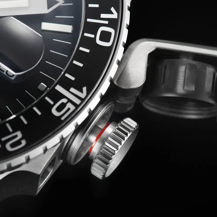 リューズ本体の伸縮性を保つため、あえて非ねじ込み式とし、外側の黒色カバーをねじ込むことで防水性を確保する独自構造。外部からの大きな衝撃からムーブメント内部へのダメージを徹底的に低減します。
