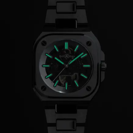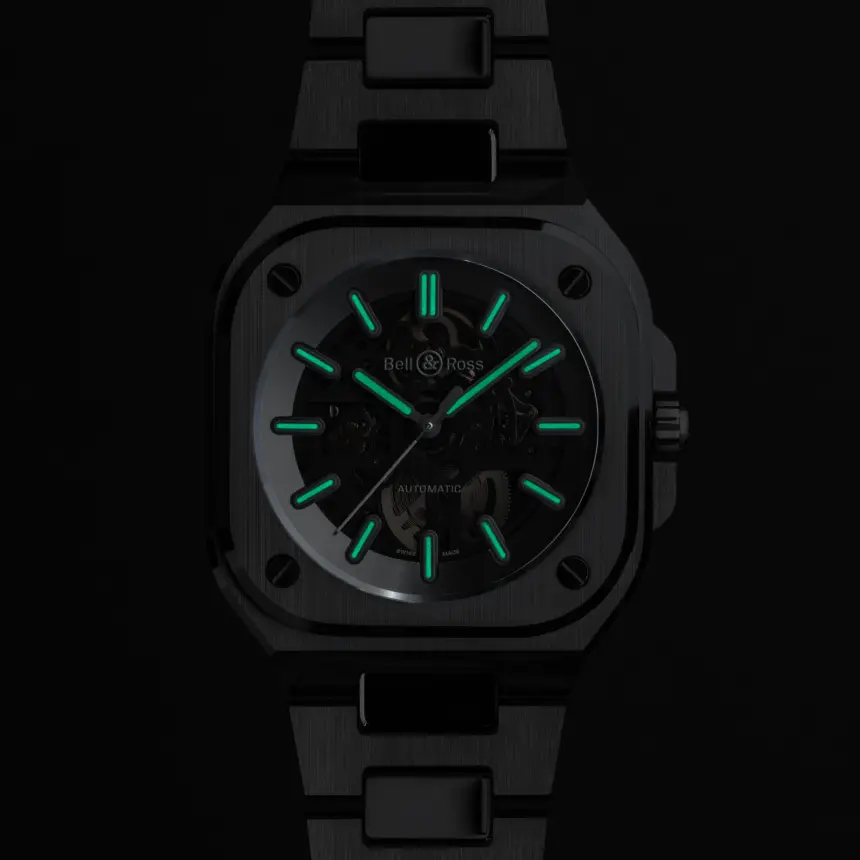 カラーサファイアダイヤル越しに浮かび上がるのは、ロジウムコーティングのスケルトンムーブメント。インデックスと針にはブラックのSuper-LumiNova®が塗布され、暗闇で鮮やかなグリーンの光を放ちます。アクティブな場面のために設計され、ブランドの厳しい視認性基準を満たす傑作です。