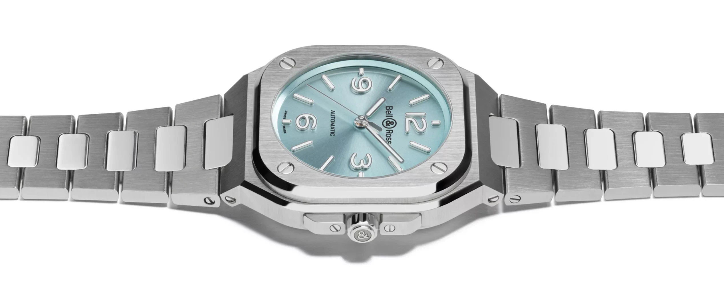 BR-05 36MMは、光沢のあるサンレイ仕上げのアイスブルーダイアルを備え、ポリッシュとサテン仕上げが交互に施されたステンレススチール製ケースが特徴。その美しい仕上げは、抜群の着け心地を誇るブレスレットと調和しています。