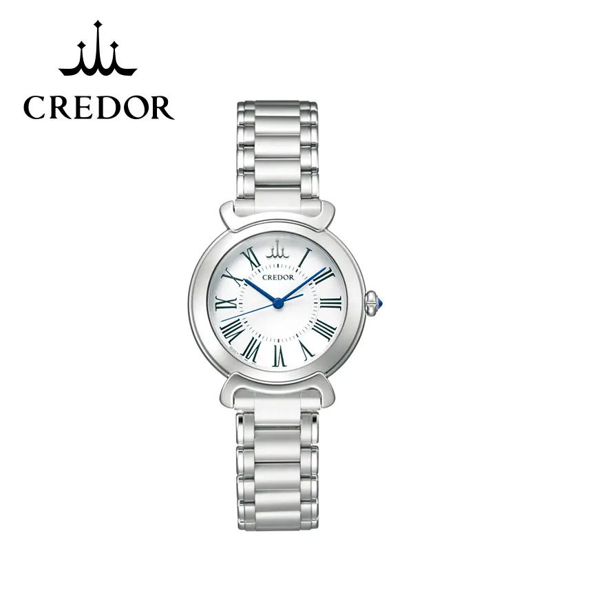 りゅうずには、透明感あるブルーサファイア(0.04カラット)を一粒セッティング。全体がシンプルだからこそ、サイドに配された一筋の青が、持つ人の高潔な審美眼をさりげなく証明します。