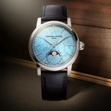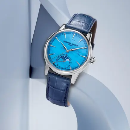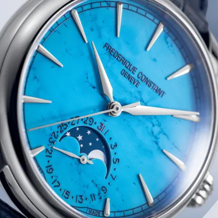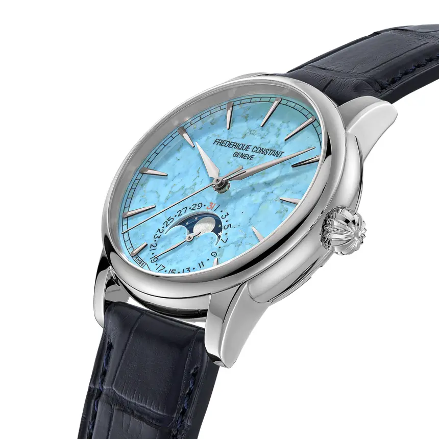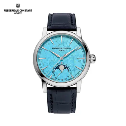 33番目の自社開発キャリバー“FC‐716”搭載。72時間のロングパワーリザーブが特徴です。青色や緑がかった美しい色あいをもち、トルコ石とも呼ばれるターコイズを採用した文字盤には、手仕事でダイヤモンド研磨によるファセット加工が施された時針と分針、インデックスが配され、6時位置の窓には、ムーンフェイズとデイトの2つのコンプリケーションを統合させたカウンターを配置。このモデルには5年間の国際保証が付帯されています。