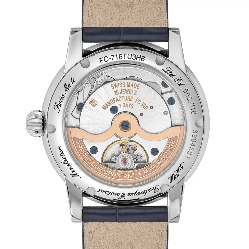 2024年に発表。2015年に発表したFC-715のパーツの90%以上を流用しつつ、香箱を18%大きく、主ぜんまいを31%長く設計変更することで、72時間のロングパワーリザーブを実現。ブリッジには美しいコート・ド・ジュネーブ装飾を施しています。