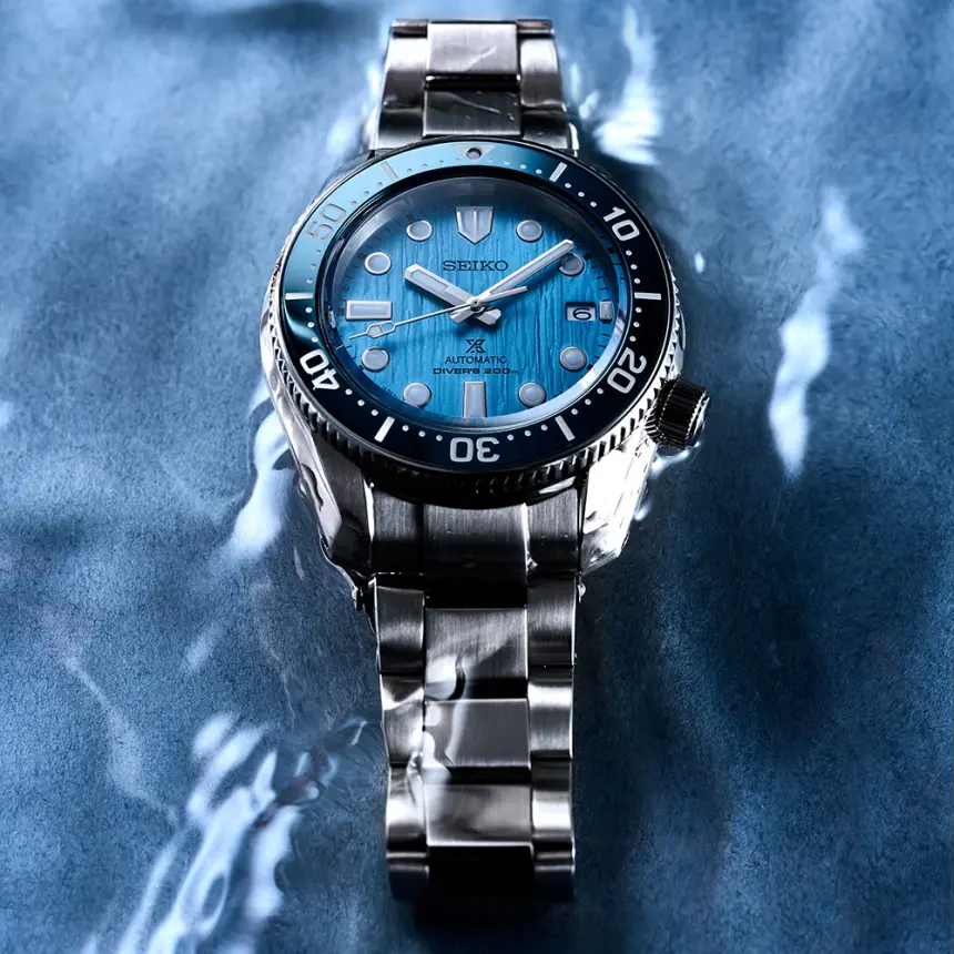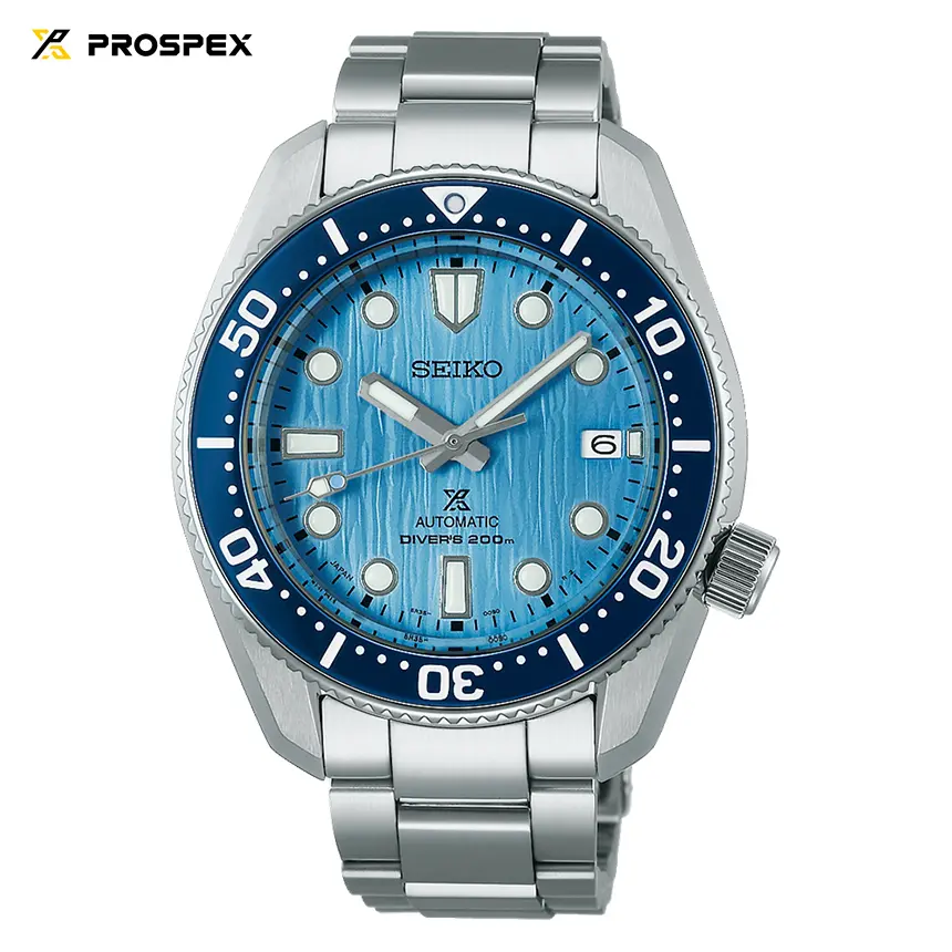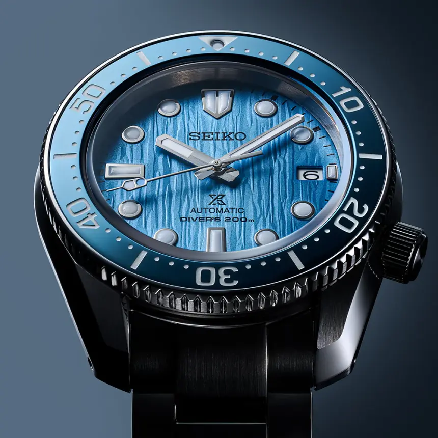 1968年に発表された伝説的ダイバーズを現代的に解釈した本作は、海洋保護活動支援“Save the Ocean”を象徴するコレクションです。セイコーダイバーズの原点であり、挑戦の象徴でもある極地。そこに広がる壮大な氷河の世界を、精緻な型打ちパターンとライトブルーのグラデーションダイヤルで表現しました。