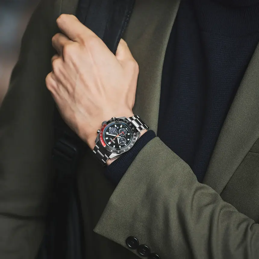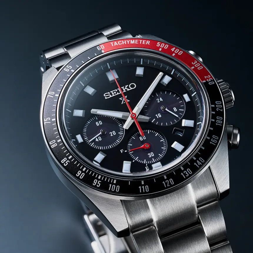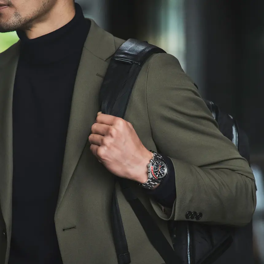センターのクロノグラフ針と6時位置の分積算針には、視認性を高める差し色を採用し、プロの計測機器としての判読性を徹底追求。緻密なヘアラインと鏡面の仕上げ分けを施したケース、そして手首に馴染むシェイプを効かせたブレスレットが、スポーティーかつ高貴な印象を与えます。