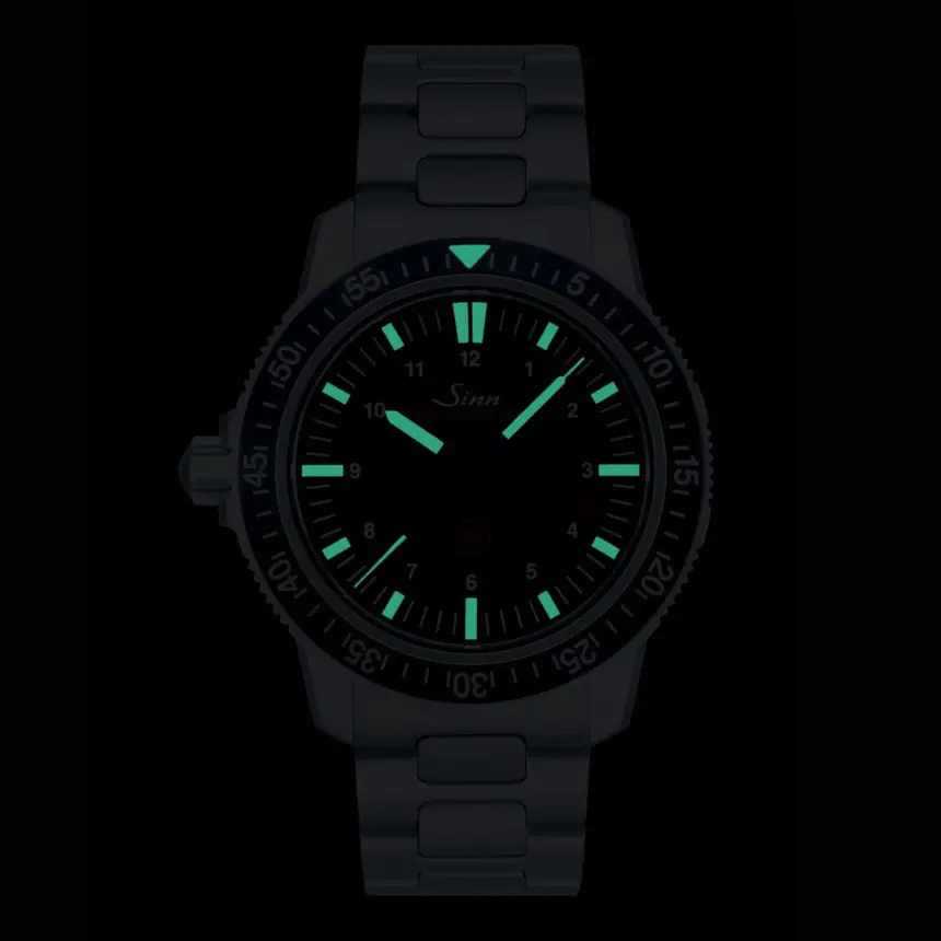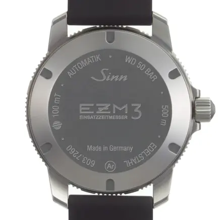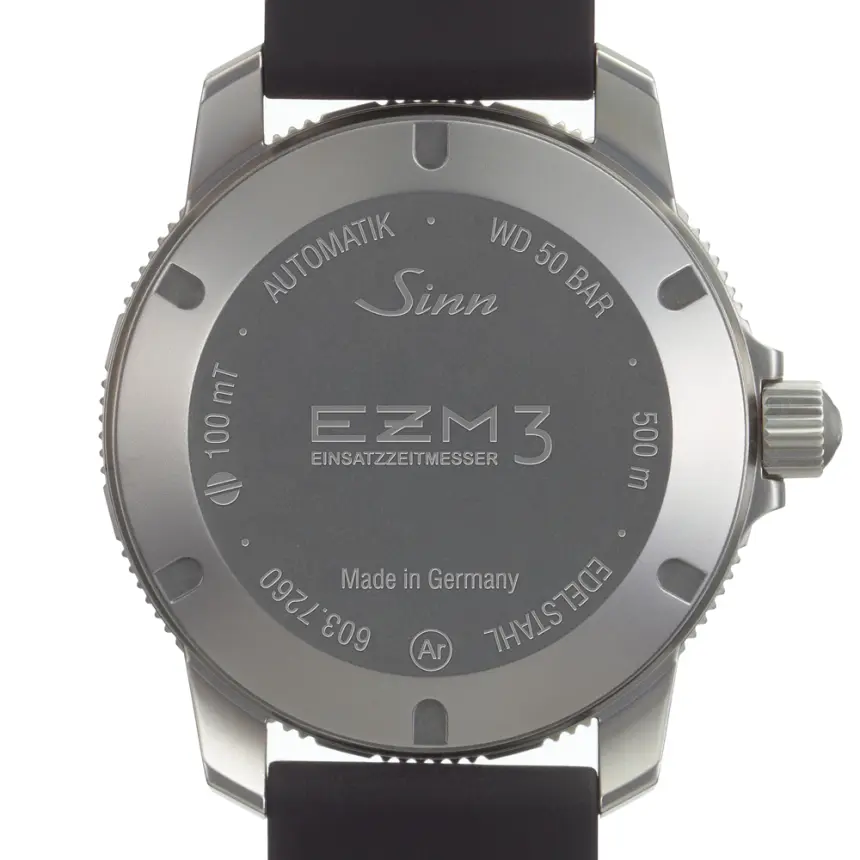 EZM(アインザッツ・ツァイト・メッサー)シリーズのモデルEZM3は、ドイツ警察特殊部隊用に開発されたダイバーズウォッチです。「使うためだけの時計」というコンセプトのもと、警察特殊部隊の使用目的や必要とされる機能を徹底的にリサーチし、成功する選択肢しか許されない特殊部隊の最高のパートナーとなるため、ヒューマンエラーを排除したデザインと機能性、過酷な使用条件に耐えうる耐久性を追及しました。80,000A/mという驚異の防磁性能、ドライテクノロジーによる除湿機構、ジン特殊オイル66-228の使用による-45℃から+80℃という広範囲の温度での精度保証、逆位置のリューズなどを採用し、これこそが計測機器の原点と言えるモデルです。